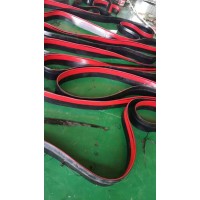 | 皮帶機防溢裙板 250*16 膠皮擋板 導料槽密封防溢裙邊 導料槽 防溢裙板 密封防溢裙板 夾持器固定防溢裙板 ■普通導料槽密封存在的問題 目前,導料槽兩側密封條多采用普通橡膠皮帶切制,通過角鋼、楔形鎖緊裝置等,與導料槽固定在一起.該密封方式存在的主要問題有: 1、密封條 性差.使用很短時間后就磨損嚴重,密封條不能與皮帶緊密接觸,密封效果差,漏風跑粉現象嚴重,現場粉塵大,環境惡劣. 2、密封條沒有上下變形量.在皮帶靜止狀態下安裝的密封條,一旦固定完后,當皮帶載料而產生下沉量后,密封條就與皮帶產生間隙,灑煤、跑粉現象嚴重. 3、密封條為單密封,不如雙密封效果好. 4、更換密封條工作量大. 為解決普通導料槽密封存在的問題,我公司技術人員根據皮帶運行特點及導料槽結構,成功研制了雙密封防溢裙板,從根本上解決了導料槽兩側灑煤、漏風、跑粉現場,對降低皮帶走廊內粉塵濃度起到了重要作用. |